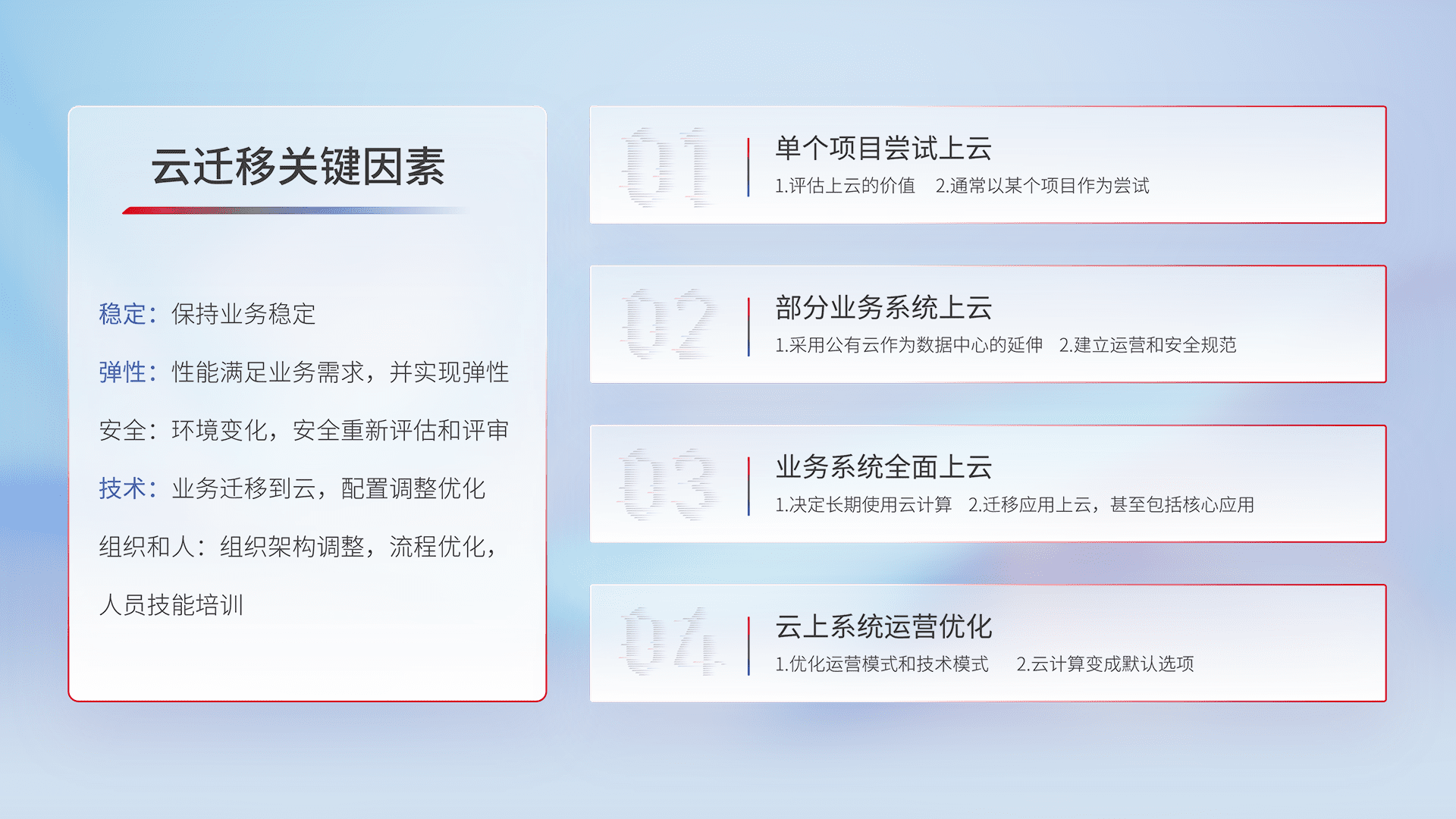 结合实际业务,,,从规划设计、、、、云平台选型、、、云原生改造、、、、数据迁移、、、、集成交付,,,,迁移全过程为客户识别最佳上云路径,,,,做好风险识别管理,,,,设计网络架构、、、身份权限、、、安全审计合规、、操作审计、、、、日志审计、、、监控告警策略、、、多站点容灾设计等,,,,对云上基础设施进行整体规划,,,,提升IT治理水平,,,以满足弹性、、、、高可用、、、、高性能的需求。。。。